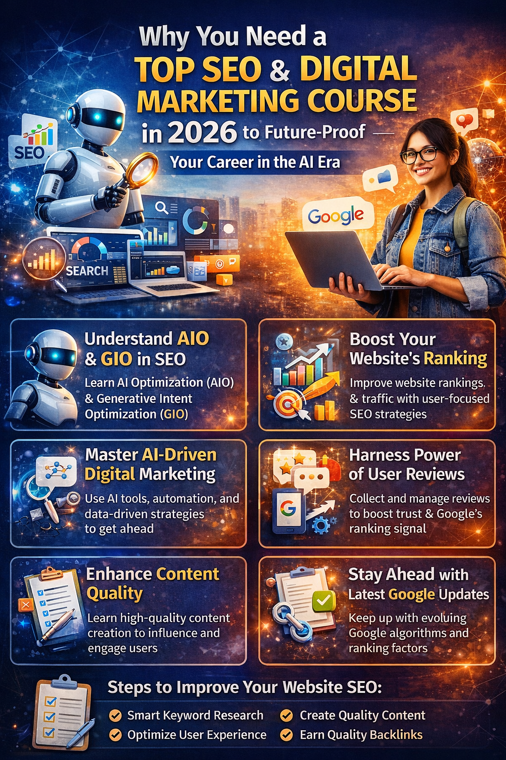 Best SEO Course & Top Digital Marketing Course in 2026: Future-Proof Your Career in the AI Era. The digital landscape is evolving faster than ever before. What worked in digital marketing and SEO just a few years ago is no longer enough today. With the rise of artificial intelligence, search engines have become smarter, user behavior has become more complex, and competition has intensified.If you are serious about building a career or growing your business online, learning digital marketing in a modern, strategic way is no longer optional—it is essential. In this blog, we will explore: